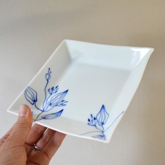 瀬戸染付 眞窯 15cm角皿 シオデ/レースフラワー