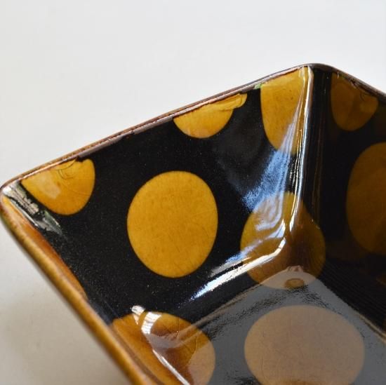 静岡県で作陶されている芦澤和洋さんのスリップウェアの器は、黒と飴釉のコントラストが美しく映えるような文様が描かれています。