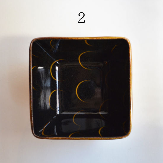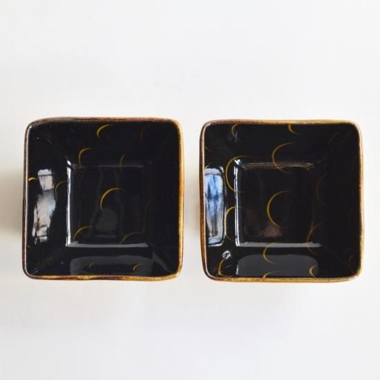 静岡県で作陶されている芦澤和洋さんのスリップウェアの器は、黒と飴釉のコントラストが美しく映えるような文様が描かれています。